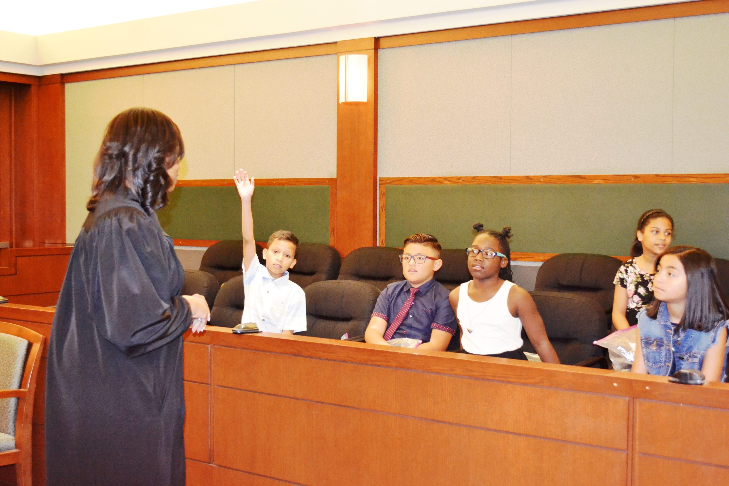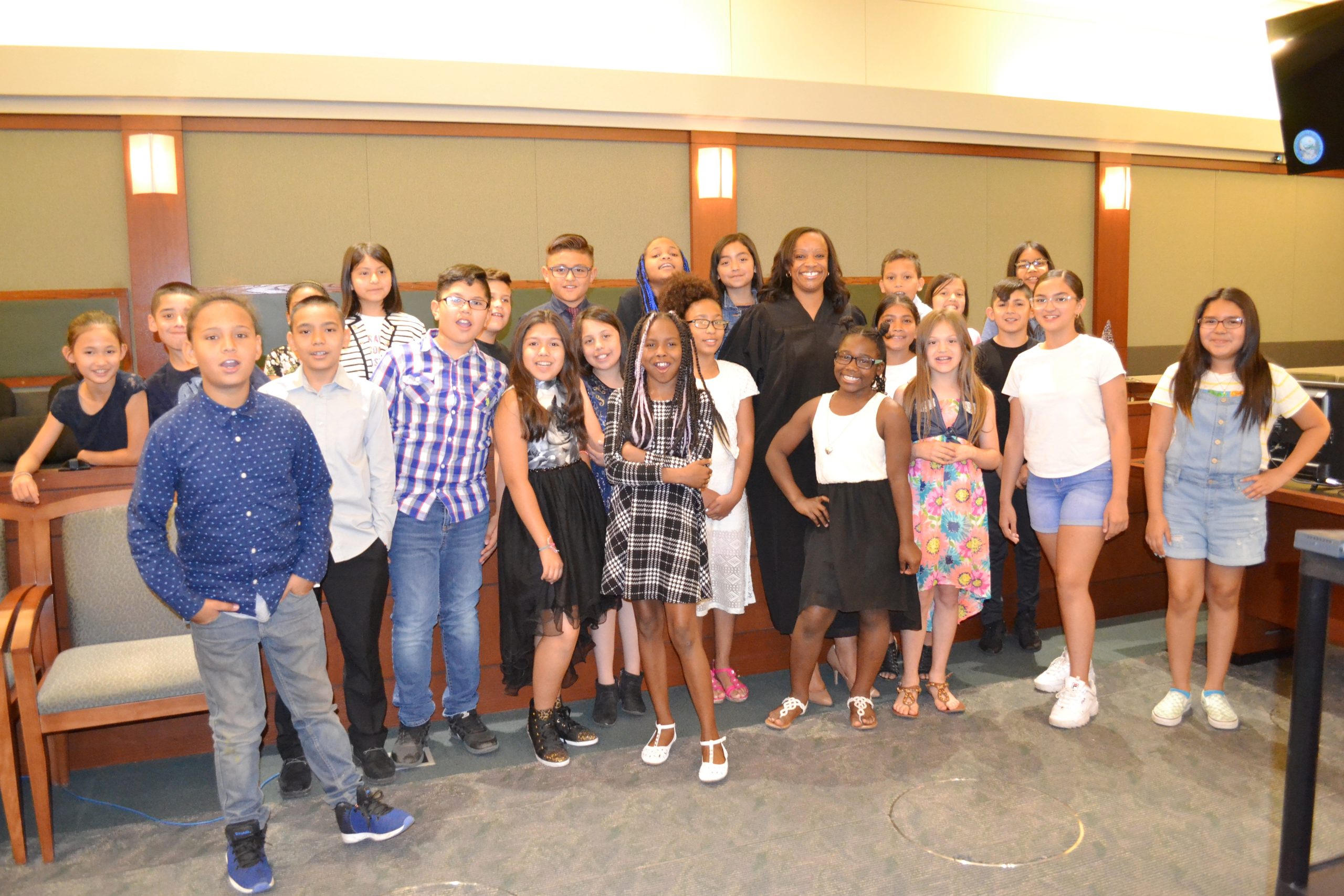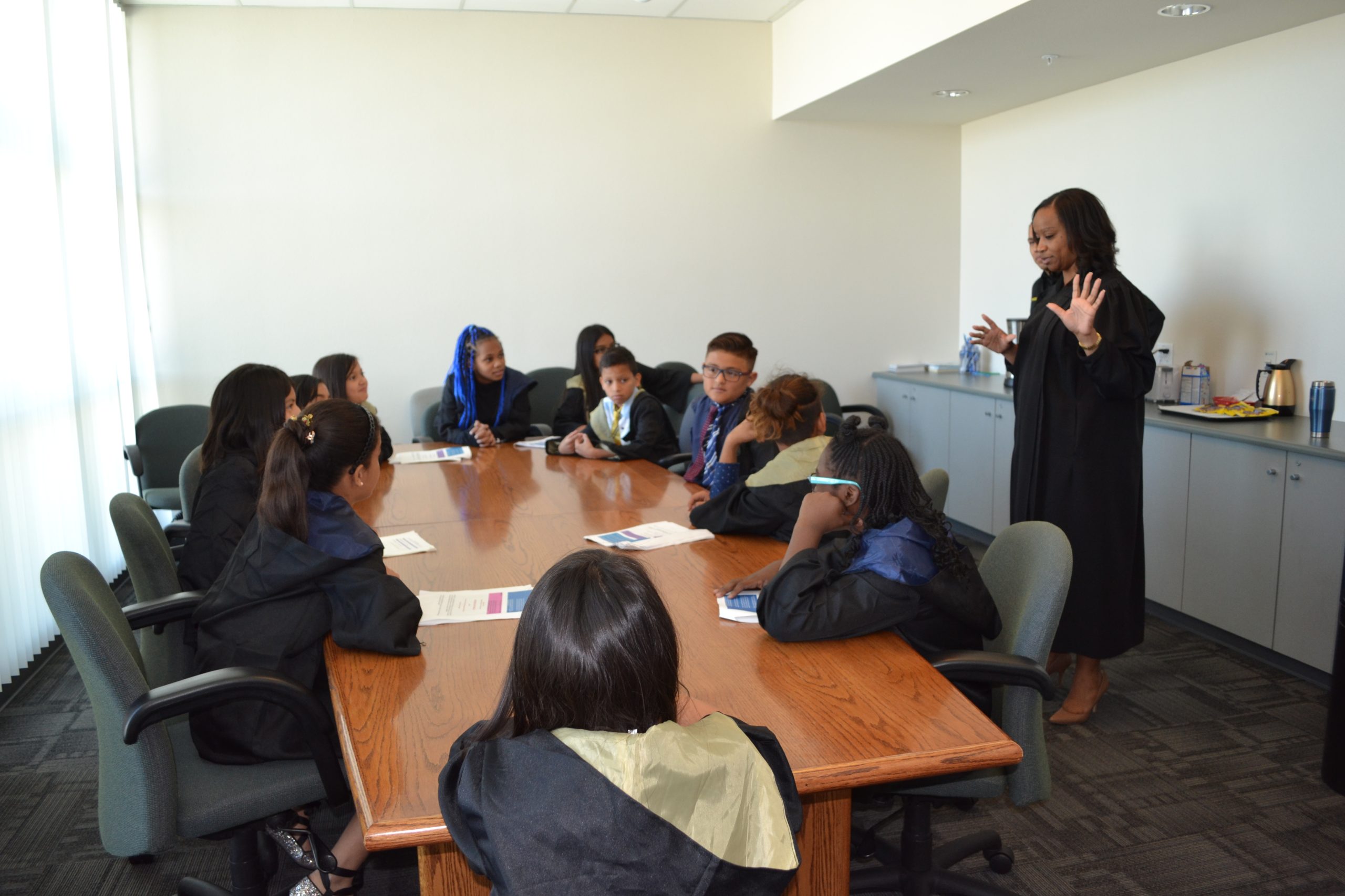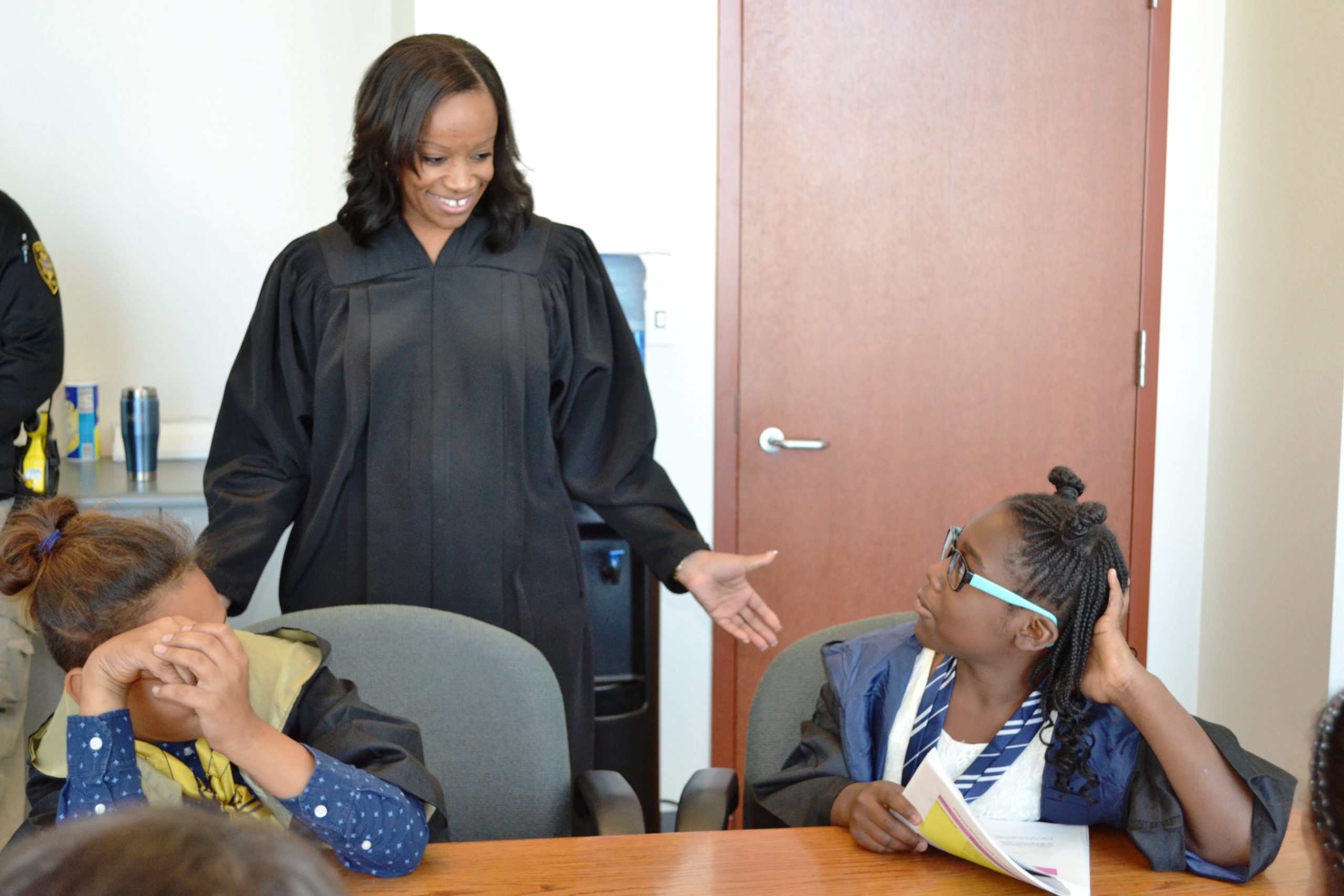 - Judge Tierra Jones with students during a mock trial.