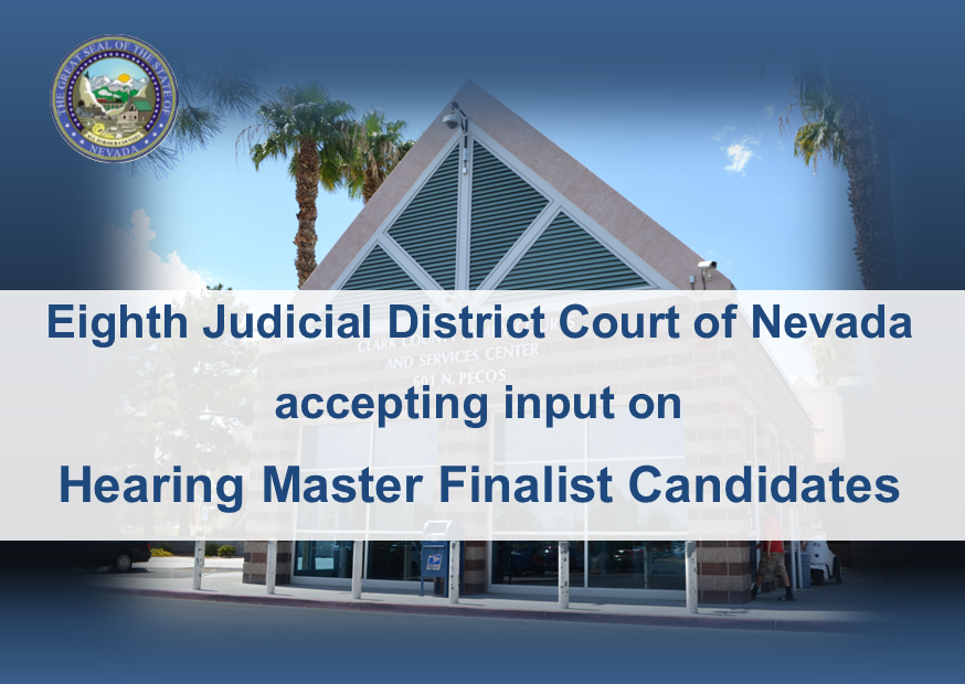 The public is invited to provide comments regarding finalists for a Court Hearing Master – TPO position with the Eighth Judicial District Court. Public input is part of a three-tiered recruitment process established in an administrative directive for selecting District Court hearing masters and commissioners. Input on the candidates can be e-mailed to the Eighth Judicial District Human Resources manager’s office EJDCRecruitment@clarkcountycourts.us, mailed to 200 Lewis Ave, Las Vegas, NV 89155, or FAX to 702-671-4560. The public comment period will be open until Thursday, April 17, 2025 at 5:00 p.m.